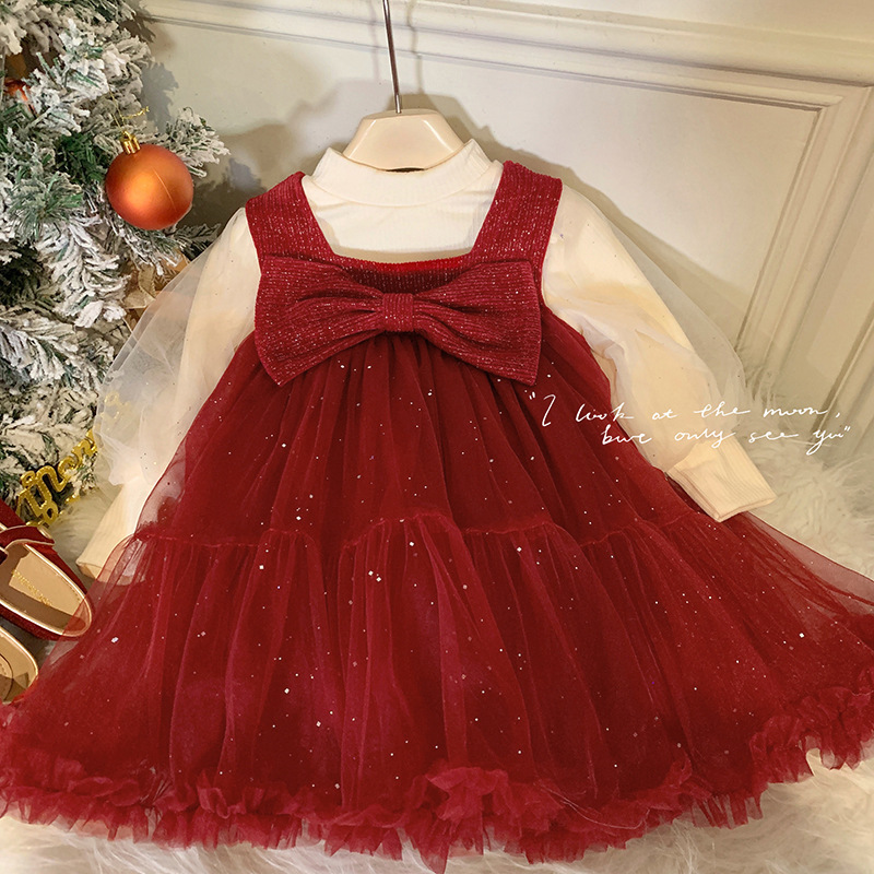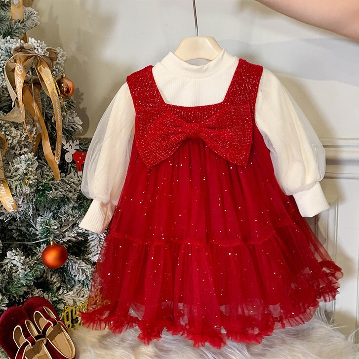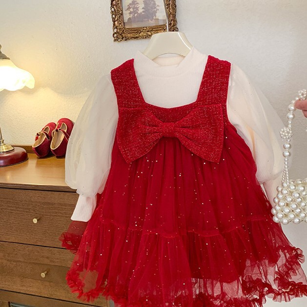 <兩件組> 加絨澎袖上衣+蝴蝶結背心紗裙 紅色 90-140cm #23257