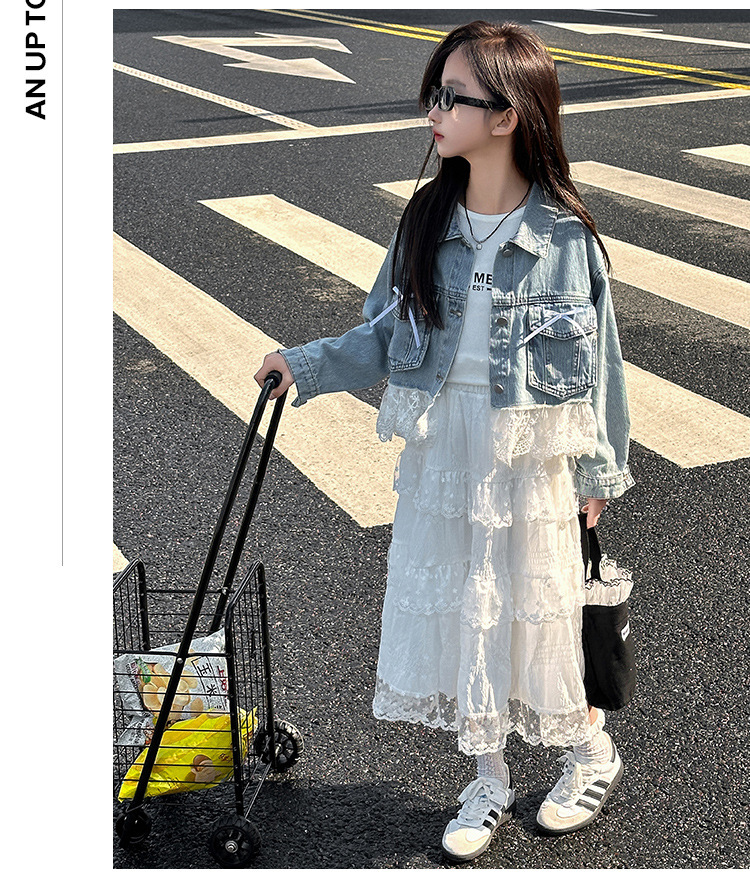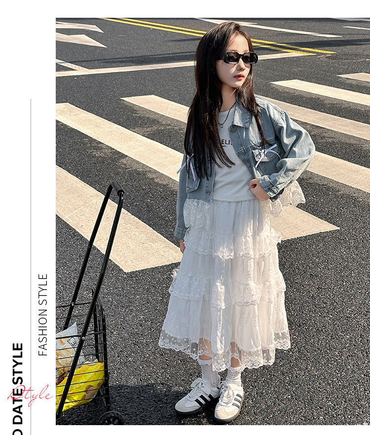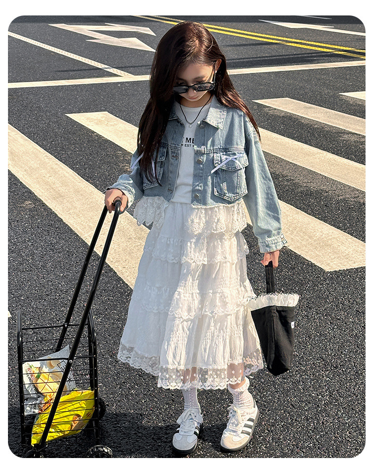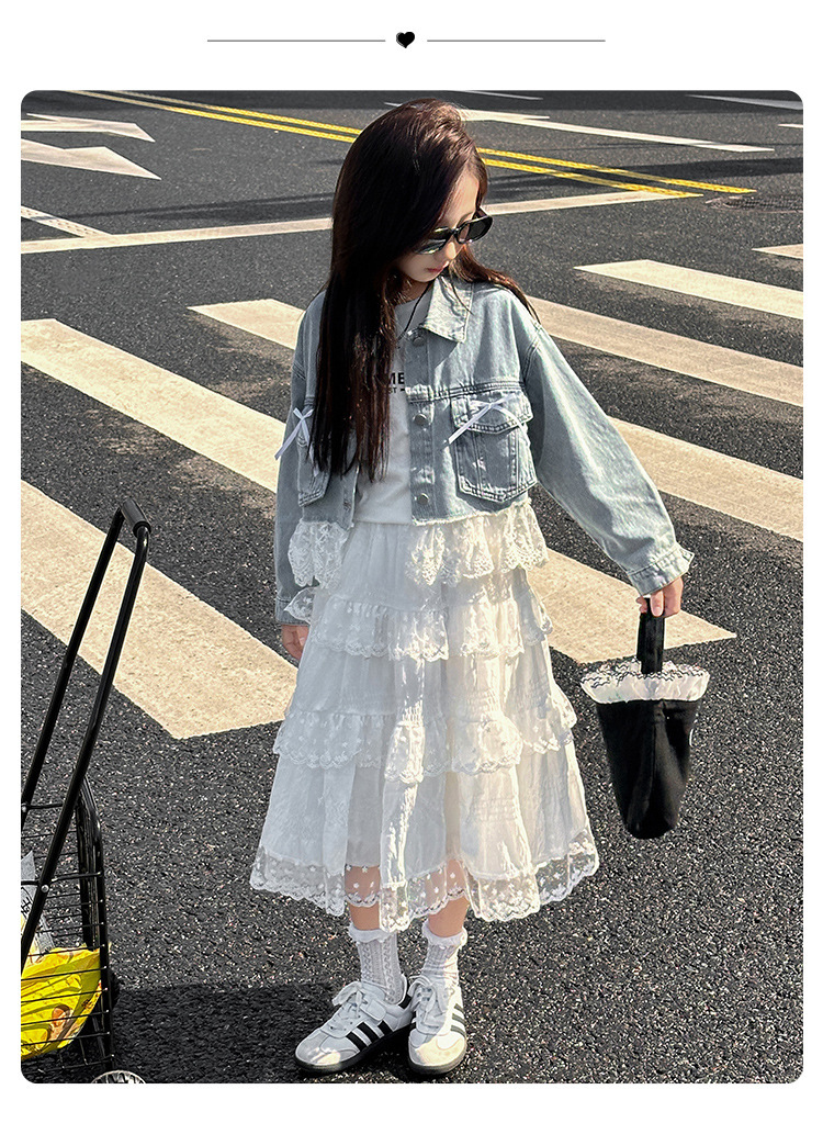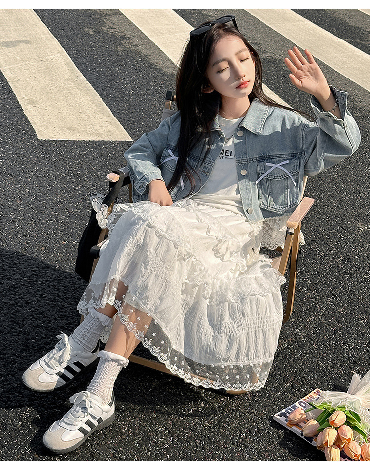 <兩件組> 下擺蕾絲牛仔外套+蕾絲蛋糕裙 130-170cm #8111