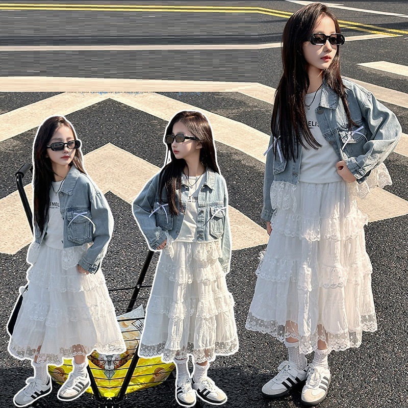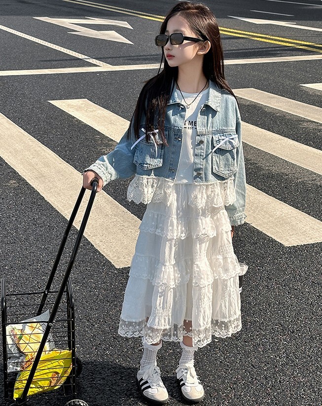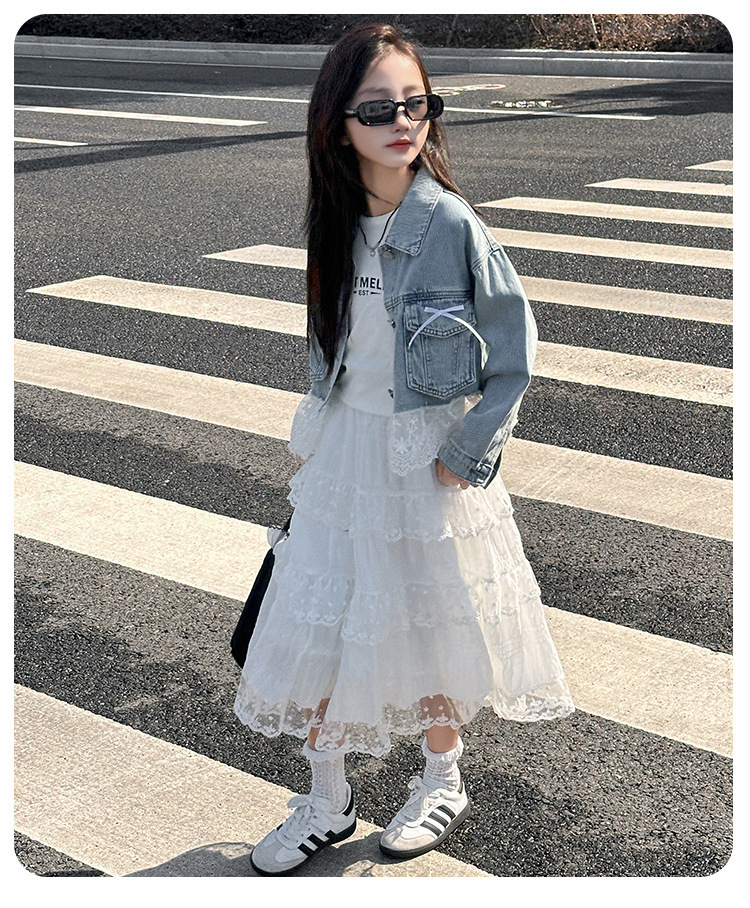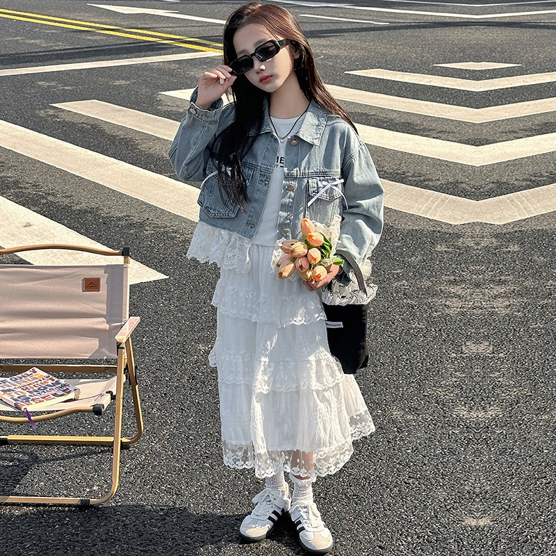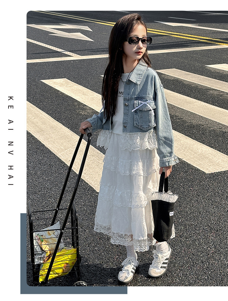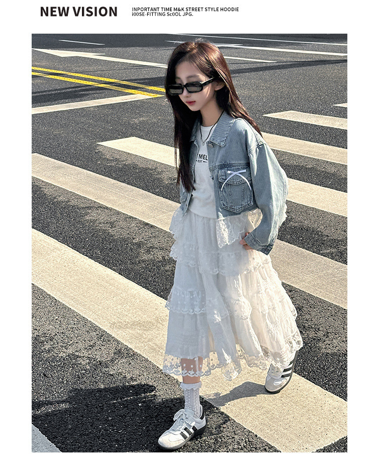 <兩件組> 下擺蕾絲牛仔外套+蕾絲蛋糕裙 130-170cm #8111