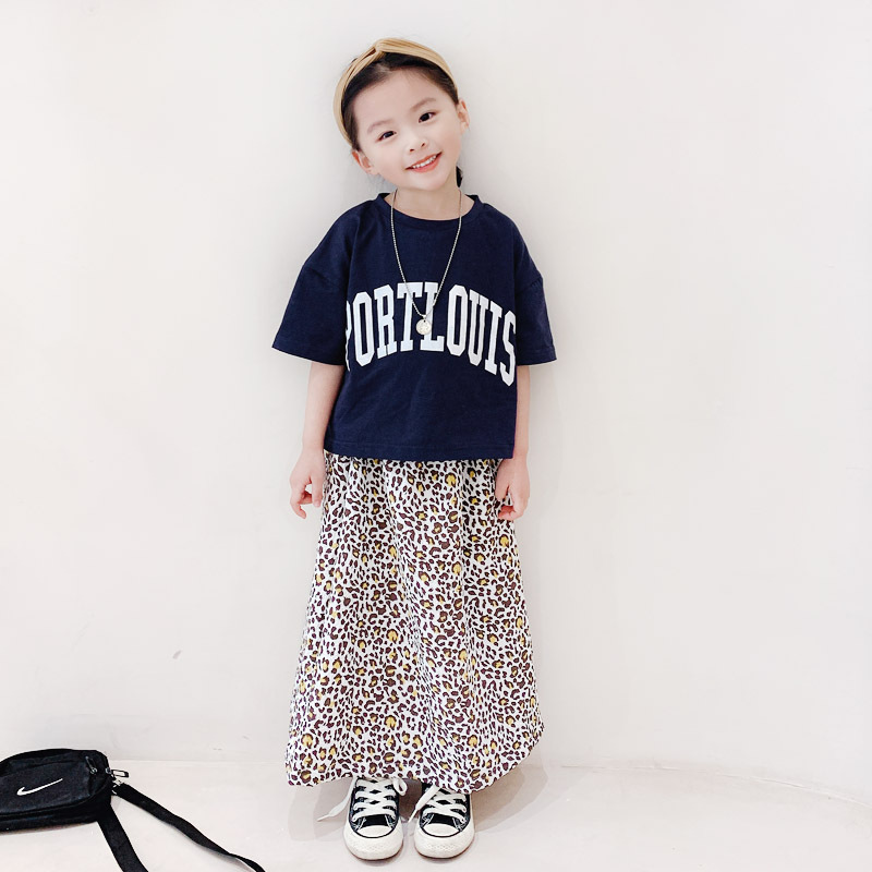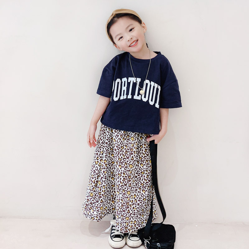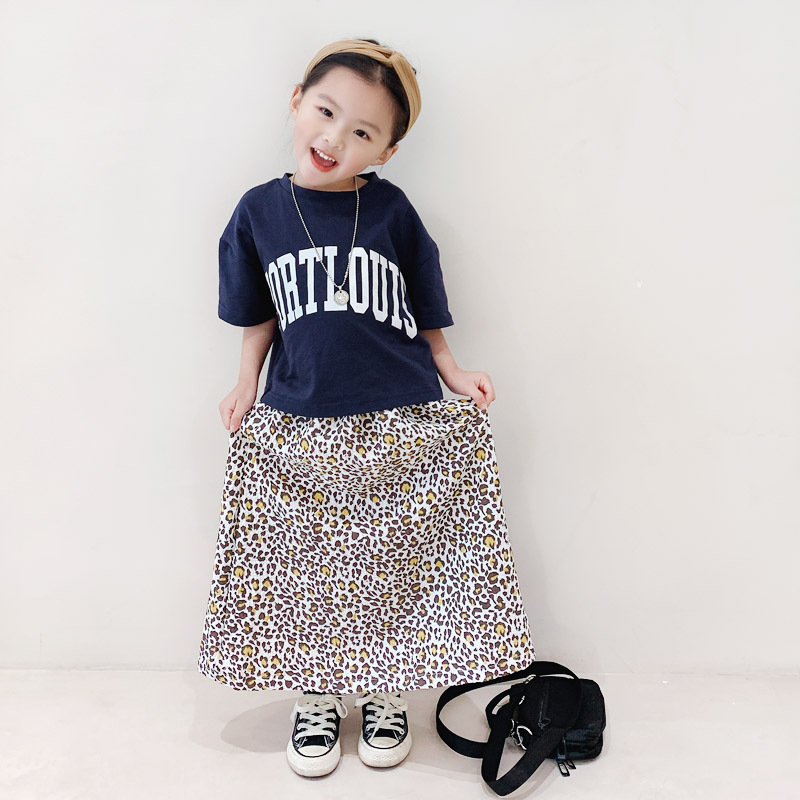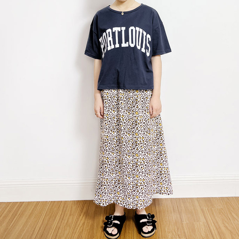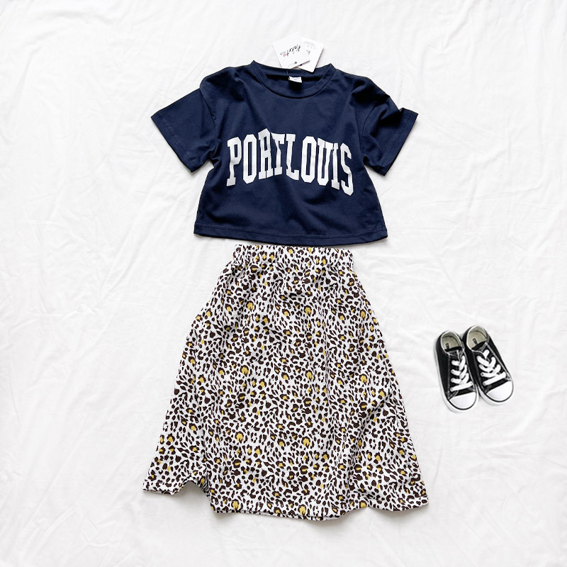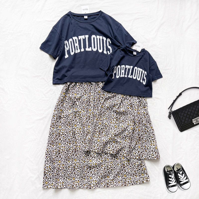 親子款 深藍字母短T+泡泡豹紋長裙