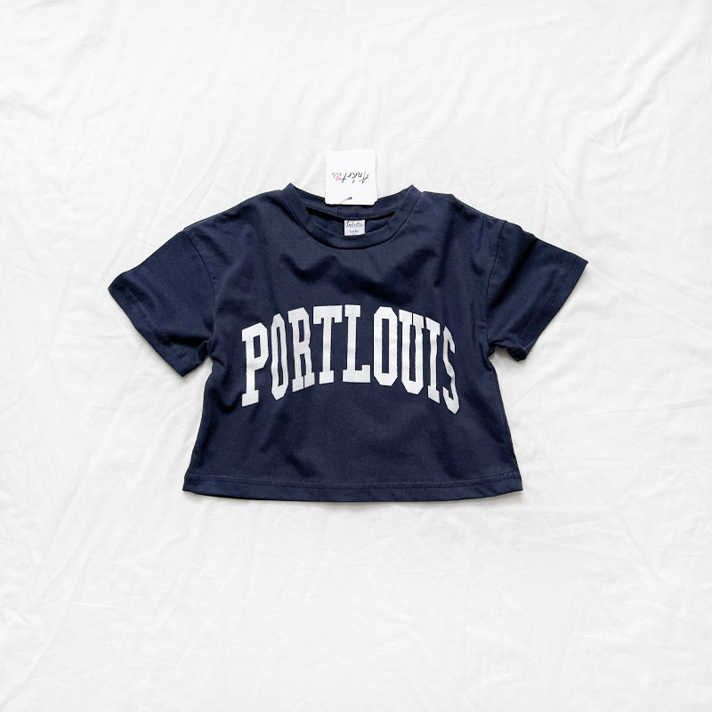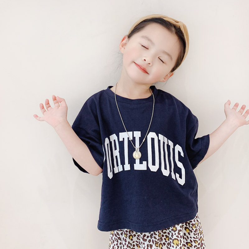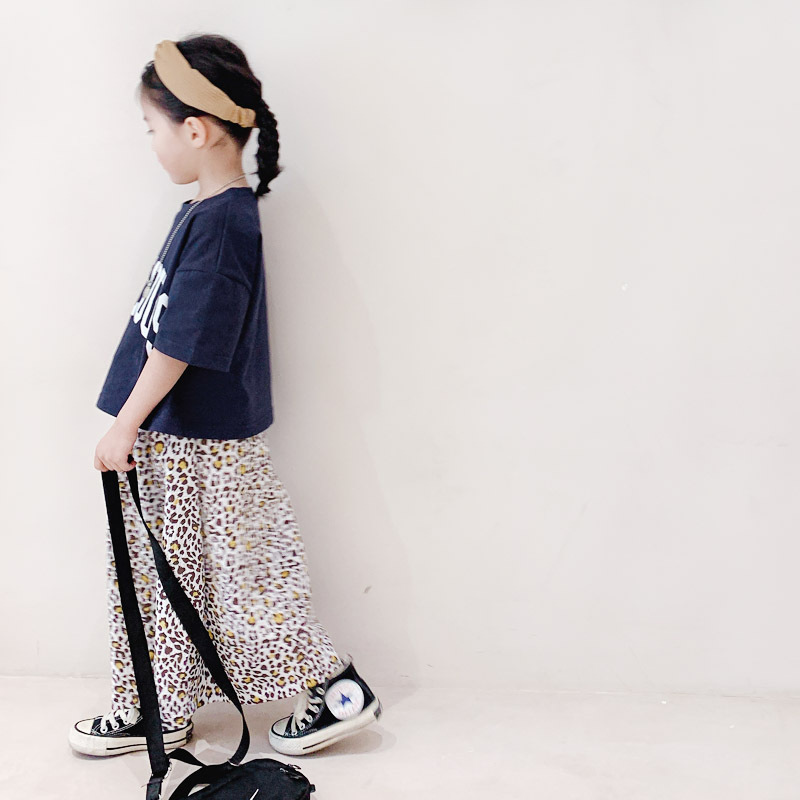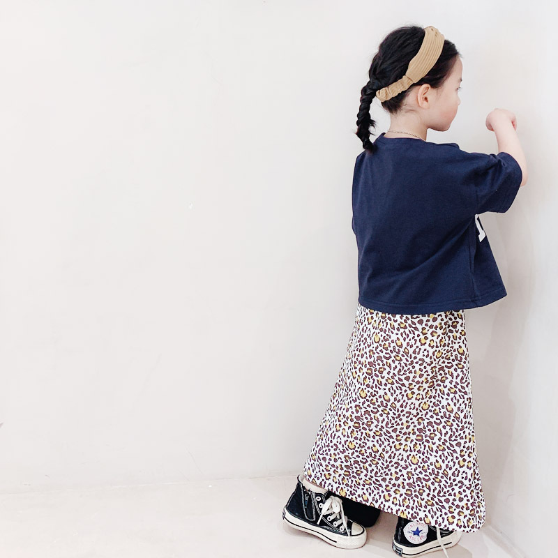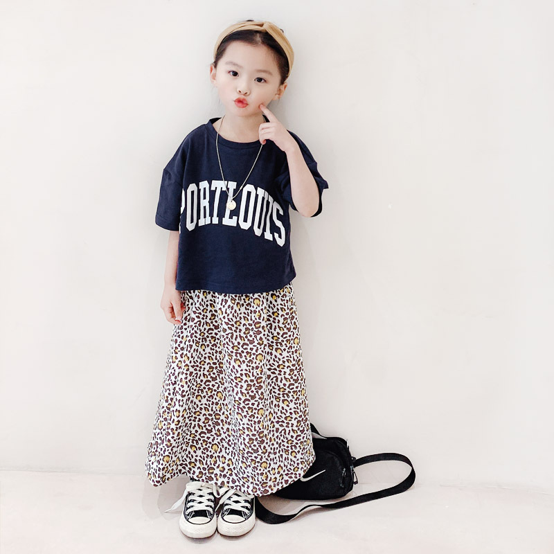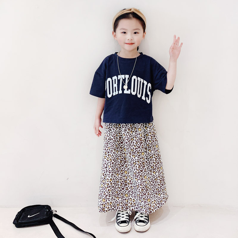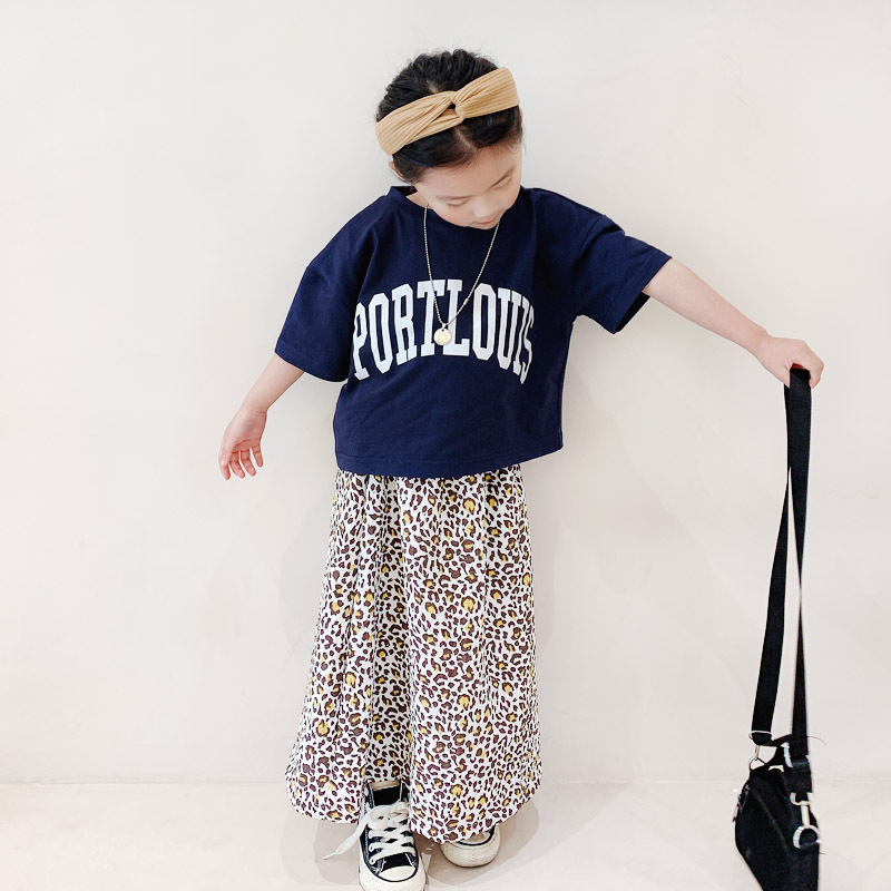 親子款 深藍字母短T+泡泡豹紋長裙
