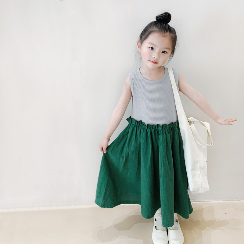 親子款 坑條背心拼接棉麻連衣裙  白色
