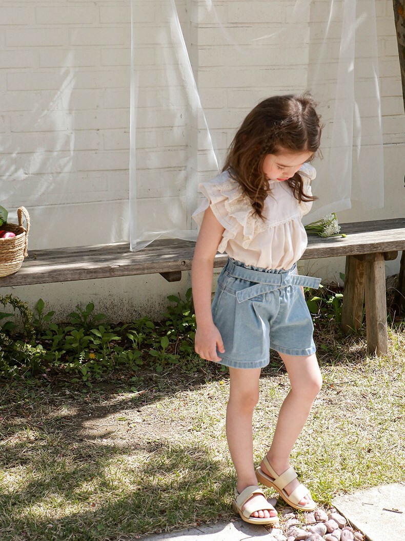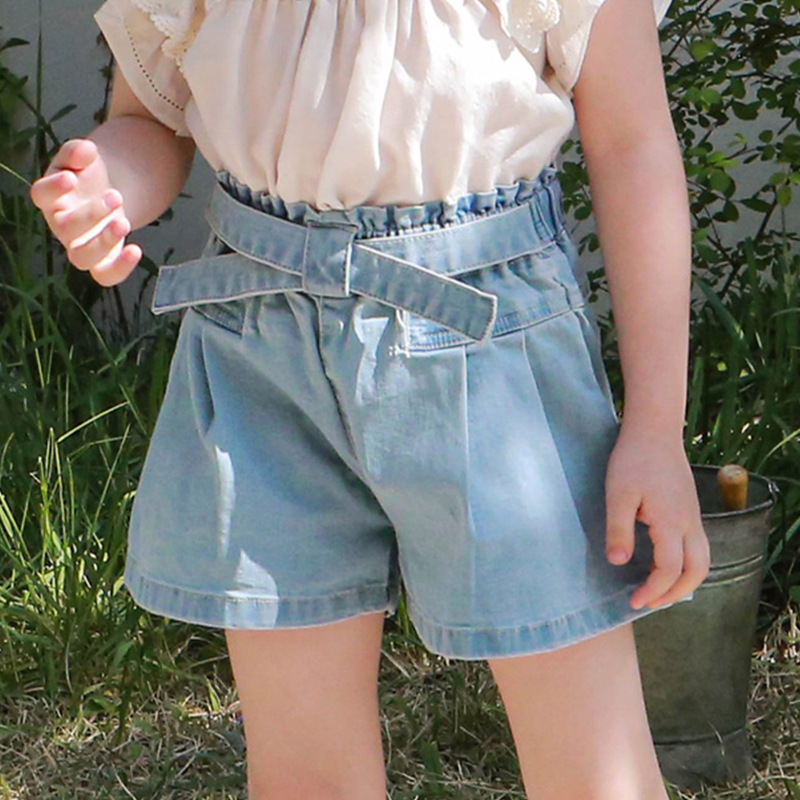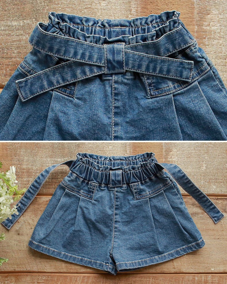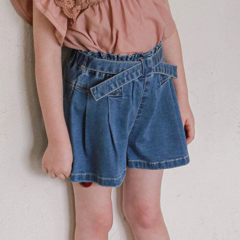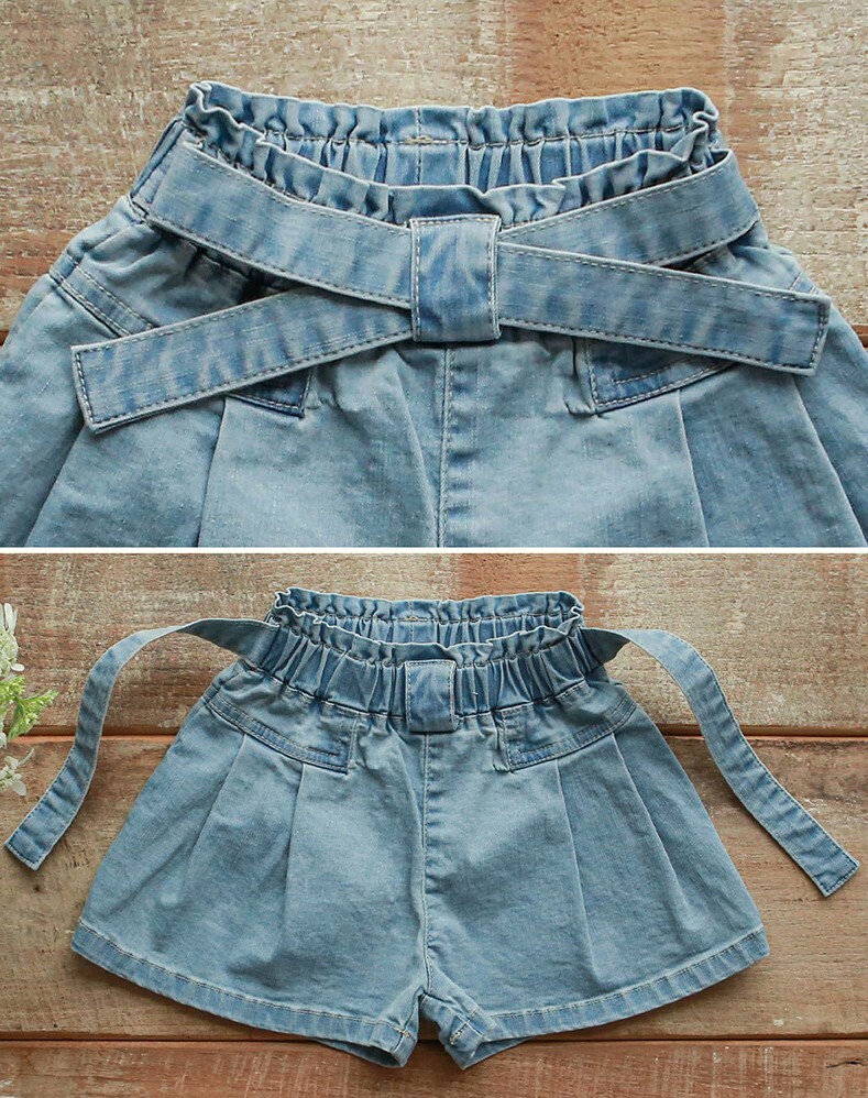 交叉腰帶壓褶牛仔短褲 2色