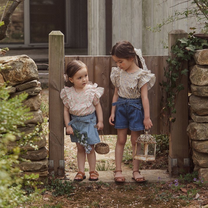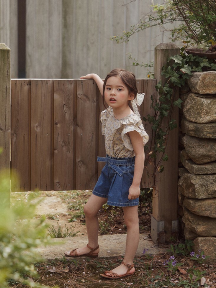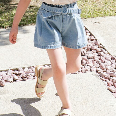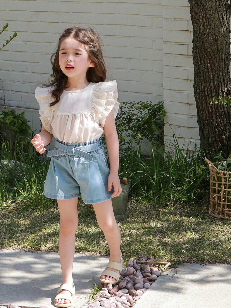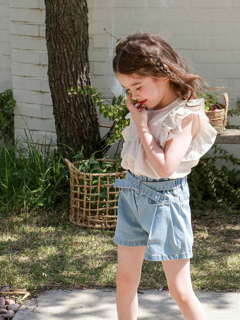 交叉腰帶壓褶牛仔短褲 2色